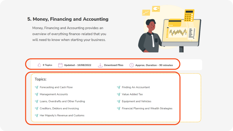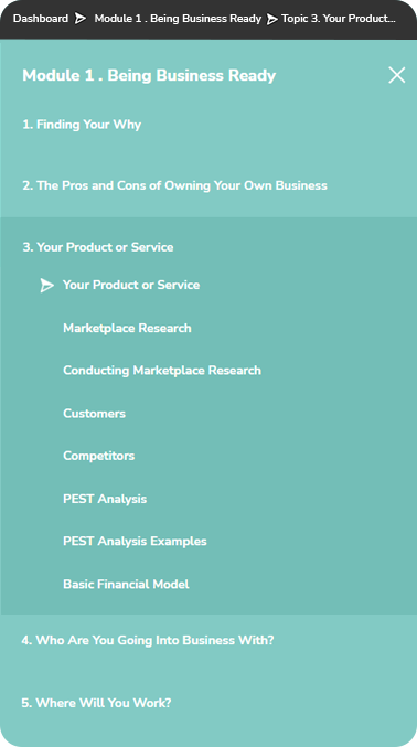 Work through comprehensive Business Modules at your own pace. Your dashboard will show you the topics included in each module, when the information was last updated, approximately how long the module will take to complete, as well as any relevant files or resources to download.