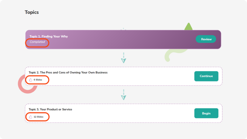 Each module includes a number of topics detailing important information relevant to that module. On each module’s page, the topics are listed chronologically for you to work through. You’ll also see the number of slides in each topic. ‘Begin’, ‘continue’ and ‘review’ will show you your progress, allowing you to jump right back in where you left off or go back and remind yourself of previously seen slides.