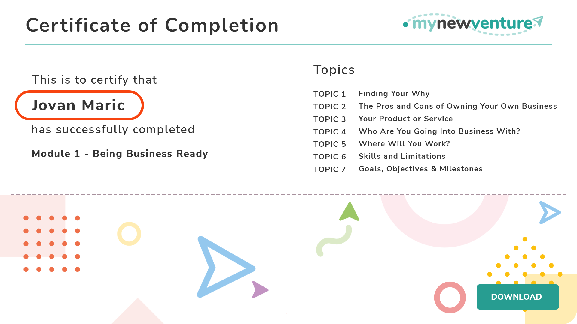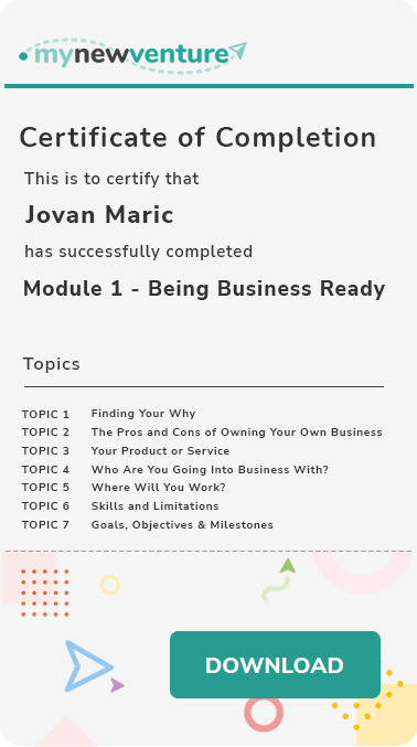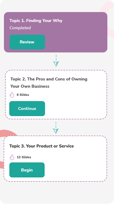 Simply, everything that will help you build a new business, or decide if this path is really for you. Work through the modules and topics below with information presented through slides, videos, infographics, tables and downloadable resources.