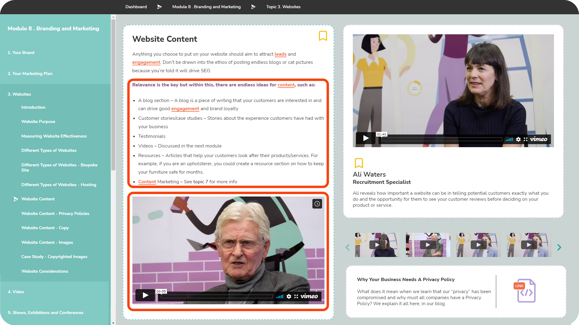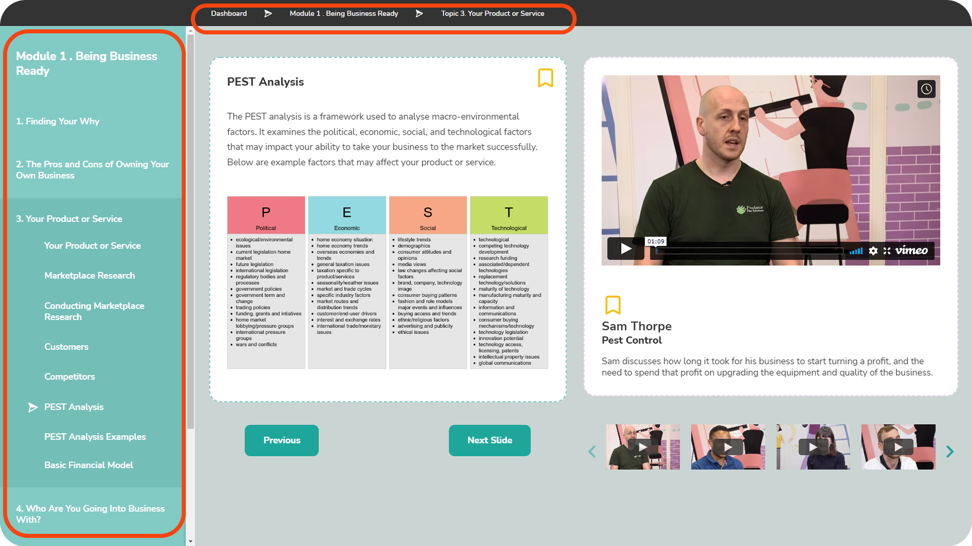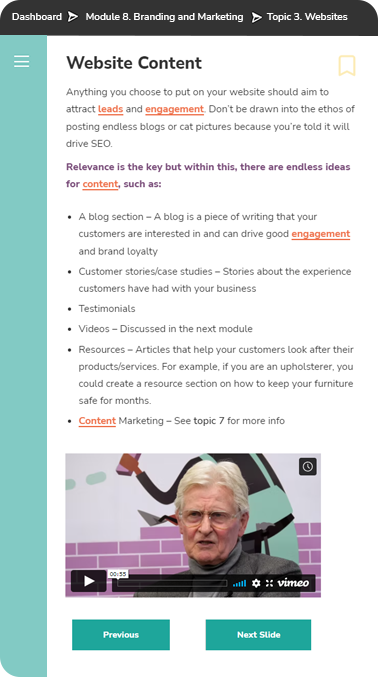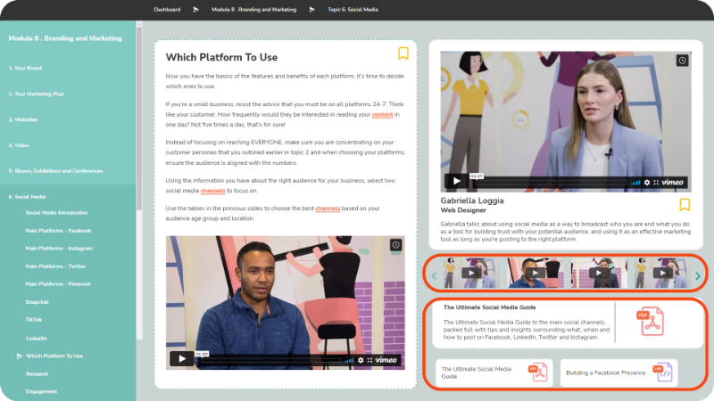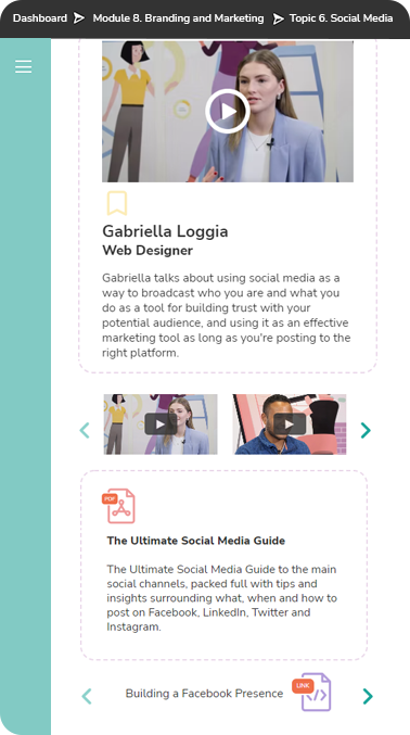 The topic content is presented on slides split into 2 sections. The right slides include supporting resources for that particular topic. Resources available include a host of videos from business owners and entrepreneurs, as well as useful templates, blogs, guides and articles to give you even more information and help you put ideas into action.