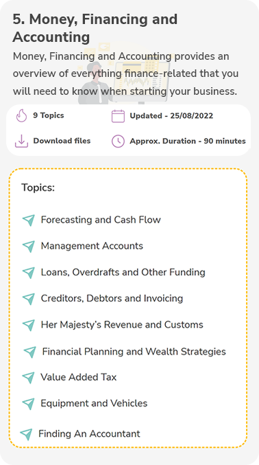Money, Financing and Accounting provides an overview of everything finance-related that you will need to know when starting your business.
